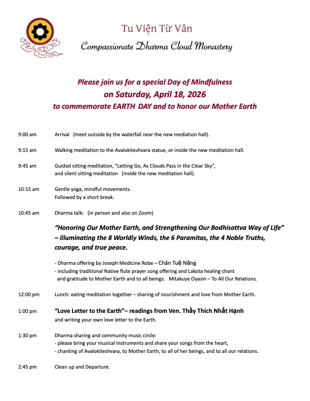 10:45 am Dharma talk (in person and also on Zoom): “Honoring Our Mother Earth, and Strengthening Our Bodhisattva Way of Life”– illuminating the 8 Worldly Winds, the 6 Paramitas, the 4 Noble Truths,